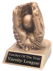 The gold color Baseball in Glove Resin Trophy Statue. This resin statue trophy is great for baseball, softball or t-ball awards, it is about 4 1/4 inches. A great trophy value at $5.99 and you'll get 40 characters of free engraving on each trophy. Additional engraving is 7 cents per character.