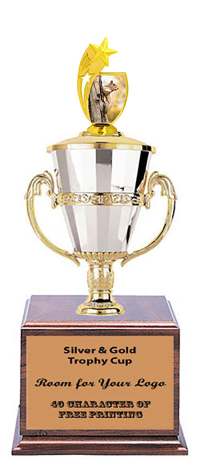 Your trophies may be purchased from 8 to 18 inches tall, allowing you to adjust the heights of the trophies in relation to placement. You may choose another squirrel insert below; we have three, or it may be possible to put your club or organization's logo on the topper instead of the squirrel.