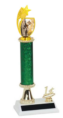 is a single-post trophy with a round column. This trophy includes a base, a round column; squirrel image of your choice, and a reasonable amount of printing. The R1SQ2 round column trophy is a great-looking award for starting at under $10 dollars. Your trophy base will be a weighted plastic base, and you may choose a white marble, black marble, or walnut color. We feel these bases look as good as marble and have less chance of breakage in shipment.